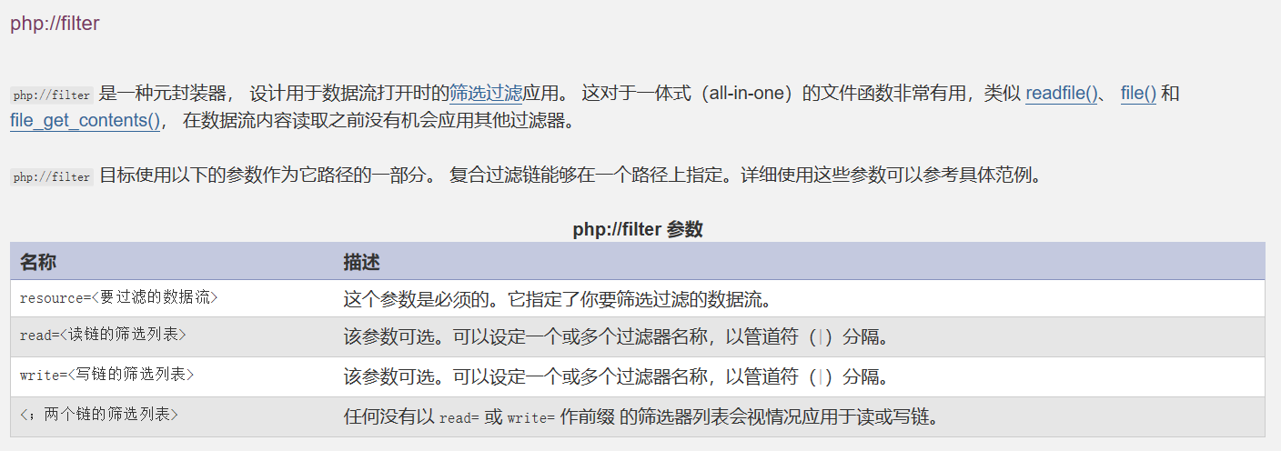 php://filter 目标使用以下的参数作为它路径的一部分。复合过滤链能够在一个路径上指定。详细使用这些参数可以参考具体范例。
