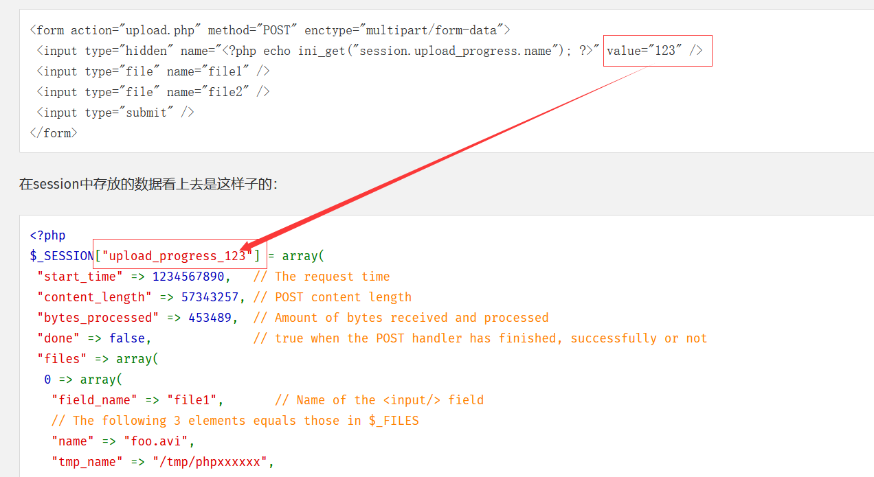 当我们在上传文件时,若存在一个上传的字段名与session.upload_progress.name的值相同的话,当前文件的上传进度信息将会保存在$_SESSION中获得。