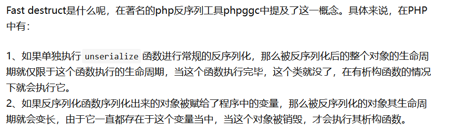 快速析构的原理: 当 php 接收到畸形序列化字符串时,PHP 由于其容错机制,依然可以反序列化成功。 但是,由于你给的是一个畸形的序列化字符串,总之他是不标准的,所以 PHP 对这个畸形序列化字符串 得到的对象不放心,于是 PHP 就要赶紧把它清理掉,那么就触发了他的析构方法 __destruct()